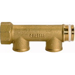 Verteilerstück, 2 Abgänge, Eingang 2 x 1 1/4 ohne Dichtring, Ausgang 2 x Innengewinde 1/2, Messing. Zur Montage von Druckluft-Entnahmestellen. Endanschlüsse 1 x Außen- und 1 x Innengewinde, Abgänge wahlweise mit Außen- oder Innengewinde.