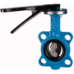 Zwischenflansch-Absperrklappe, Handhebel, Betriebstemp. -15 °C bis 120 °C, DN 125, PN max. 16 bar. Zwischenflansch-Absperrklappen mit Handhebel geeignet für Wasser/Dampf, Seewasser, Salzwasser, Ester, Keton, Alkali, Ätznatron, Natriumhydroxid. Nicht empfohlen für Kohlenwasserstoffe, Öle, Fette.