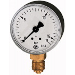 Standardmano. mit Stahlblechgeh., Einfachskala in bar, Anschluss radial unten, G 1/8, Güteklasse 1,6, Messber. 0 - 40,0 bar, Ø 40. Rohrfedermanometer in Standardausführung.
