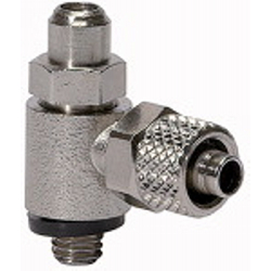 Dros.ven., Schlitzschr., beidseitige Dros. (»B«) Schnellverschr. Schlauch 6/4, M5, PN max. 10 bar, Temp. 0 °C bis 70 °C, MS vern.. Zur beidseitigen Regulierung der Kolbengeschwindigkeit von Zylindern und von Durchflussmengen. Ausführung in Hohlschraubenbauweise mit Ringstück zum direkten Anbau. Kleine Baumaße, ideal bei engen Platzverhältnissen.