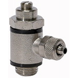 Dros.ven., Schlitzschr., beidseitige Dros. (»B«) Schnellverschr. Schlauch 5/3, G 1/8, PN max. 10 bar, Temp. 0°C bis 70°C, MS vern.. Zur beidseitigen Regulierung der Kolbengeschwindigkeit von Zylindern und von Durchflussmengen. Ausführung in Hohlschraubenbauweise mit Ringstück zum direkten Anbau. Kleine Baumaße, ideal bei engen Platzverhältnissen.
