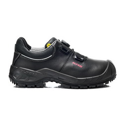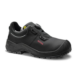 Material und Ausstattung - Rindleder - Atmungsaktives Textilfutter - Geschlossene, gepolsterte Lasche - anzflächige Einlegesohle ESD PRO black mit Anteilen aus recycelten Materialien - PU-Spitzenschutz Besonderheiten - BOA® Fit System Laufsohle Grobstollige PU/PU Sohle SAFETY-GRIP