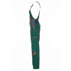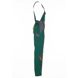 Eigenschaften und Vorteile - 2 eingesetzte Beuteltaschen - 2 aufgesetzte Knietaschen mit farblichen Applikationen - doppelte Maßstabtasche - links Oberschenkeltasche mit Patte und Klettverschluss - Handytasche - Latztasche mit Patte und Klettverschluss, - farbliche Applikationen auf der Latztasche, - Gummizug im Bund, - 2 Gesäßtaschen mit Patten, - Bundweitenverstellung mit verdecktem Druckknopf, - Reißverschluss im Hosenschlitz, - hochgezogenes Rückenteil mit Trägerkreuz, - Träger mit elastischem Gummibandeinsatz, - Sicherheitssteckschnalle an den Trägern, - Tascheneingriffe und Taschenpatten mit farblichen Biesen abgesetzt - Hammerschlaufe Materialhinweis: - Hauptfarbe: 65 % Polyester, 35 % Baumwolle, Diagonal-Köper, ca. 285 g/m² - Kontrastfarbe: 85 % Polyester, 15 % Baumwolle, Diagonal-Köper, ca. 290 g/m²