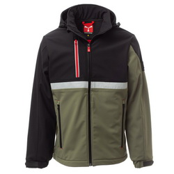 Eigenschaften und Vorteile - WP 8000 mm H2O, MVP 5000 g/m² 24 h. - Zweifarbige Herren-Softshell-Jacke - SBS-Reißverschluss mit „Semi-Auto-Lock“-Metallschieber und personalisiertem Schiebergriff. - Abtrennbare Kapuze mit regulierbarem Kordelzug. - Reflexstreifen vorne auf Brusthöhe. - Elastische Ärmelbündchen mit Klettverschluss zur Weitenregulierung. - 2 Seitentaschen mit Reißverschluss und 1 Brusttasche mit Reißverschluss mit reflektierendem Detail. - „Life-saving“-Elemente auf der Rückseite mit reflektierendem Firmenschriftzug auf der Innenseite, mit Reißverschluss. - 1 Tablet-Innentasche mit Klettverschluss. - Atmungsaktives Futter am Rücken. - Regulierbare Taille mit personalisierbaren Stoppern.