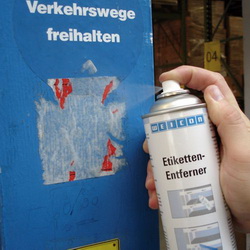 Etikett satt einsprühen, ca. 1 Minute einwirken lassen und langsam abziehen. Bei hartnäckigen