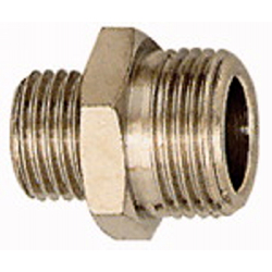 Doppelgewindenippel, G 1/2 a., G 1 a., SW 38, Messing vernickelt, Arbeitsdruck max. 25 bar, Betriebstemp. max. 150 °C. Für Luft, Wasser, Öl, Dampf etc. einsetzbar.