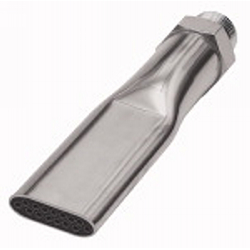 Lärmarme Flachdüse, G 1/4 AG, Sicherheitsdüse allgemeine Anwendungen, Messing vernickelt, Länge 100,0 mm, Düsenbreite 21,0 mm. Mit diesen lärmreduzierenden Düsen wird bei korrekter Auslegung, im Vergleich zu herkömmlichen Einlochdüsen, bei gleicher Blaskraft ein niedriger Geräuschpegel erreicht. Sie sind überwiegend mit einem lärmmindernden Kunststoffeinsatz bestückt und werden vom Berufsgenossenschaftlichen Institut empfohlen.