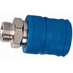 Sicherheitskupplung NW 7,4, Typ KE, Messing vern., G 1/2 AG, Betriebsdruck max. 12 bar, Mediums-/Umgebungstemp. -20°C bis 60°C. Einhand-Sicherheitskupplungen mit zweifacher Verriegelung. Das Kuppeln erfolgt wie bei Standardkupplungen durch einfaches Eindrücken des Steckers in die Kupplung. Beim Entkuppeln wird die erste Verriegelung durch Zurückschieben der Verriegelungshülse freigegeben. Das Kupplungsventil schließt. Jetzt kann die komprimierte Luft aus dem Stecker und im Schlauch entweichen. Durch nochmalige Betätigung der Entriegelungshülse wird das zweite Verriegelungssystem freigegeben. Erst jetzt kann die Verbindung sicher gelöst werden.