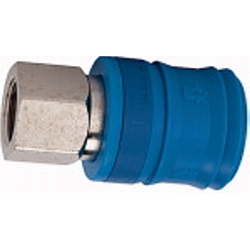 Sicherheitskupplung NW 7,4, Typ KE, Messing vern., G 1/2 IG, Betriebsdruck max. 12 bar, Mediums-/Umgebungstemp. -20°C bis 60°C. Einhand-Sicherheitskupplungen mit zweifacher Verriegelung. Das Kuppeln erfolgt wie bei Standardkupplungen durch einfaches Eindrücken des Steckers in die Kupplung. Beim Entkuppeln wird die erste Verriegelung durch Zurückschieben der Verriegelungshülse freigegeben. Das Kupplungsventil schließt. Jetzt kann die komprimierte Luft aus dem Stecker und im Schlauch entweichen. Durch nochmalige Betätigung der Entriegelungshülse wird das zweite Verriegelungssystem freigegeben. Erst jetzt kann die Verbindung sicher gelöst werden.