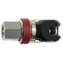 Schwenk-Sicherheitskupplung NW 7,2, EURO 7,2, Stahl, NPT 3/8 IG, Betriebsdruck max. 25 bar, Temp. -20 °C bis 100 °C. Schwenk-Sicherheitskupplung mit freiem Durchgang. Der Stecknippel wird in den Kupplungskörper gesteckt und mit einer ca. 90°-Bewegung die Verbindung hergestellt. Sobald der rote Ring in der vorgesehenen Nut einrastet, ist eine sichere Verbindung hergestellt. Um die Verbindung wieder zu lösen, muss der rote Ring zurückgezogen und der Stecknippel bis zum Anschlag in die Ausgangsposition geschwenkt werden. Durch eine Entlüftungsbohrung auf der Rückseite der Kupplung, wird beim Entkuppeln entlüftet.