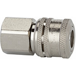 Sicherheitskupplung NW 7,8, Typ SEK, Messing vern., G 1/2 IG, Betriebsdruck 0-35 bar, Mediums-/Umgebungstemp. -10 °C bis 60 °C. Einhand-Sicherheitskupplung mit zweifacher Verriegelung. Das Kuppeln erfolgt wie bei Standardkupplungen durch einfaches Eindrücken des Steckers in die Kupplung. Beim Entkuppeln wird die erste Verriegelung durch Zurückschieben der Verriegelungshülse freigegeben. Das Kupplungsventil schließt. Jetzt kann die komprimierte Luft aus dem Stecker (Schlauch) entweichen. Durch nochmalige Betätigung der Entriegelungshülse wird das zweite Verriegelungssystem freigegeben. Erst jetzt kann die Verbindung gelöst werden.