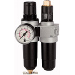 Wartungseinheit 2-tlg. »multifix-mini« mit Metallbehälter, BG 0, G 1/4, Eingangsdruck max. 12 bar, Regelbereich 0,5 - 10 bar. Zweiteilige Wartungseinheiten, bestehend aus einem vordruckunabhängigen Membrandruckregler mit Sekundärentlüftung in Verbindung mit einem Zentrifugalabscheider und einem Proportionalöler.