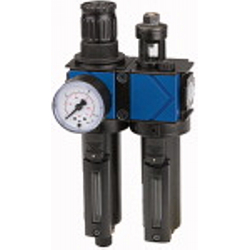 Wartungseinheit 2-tlg. »variobloc« mit Metallbehälter inkl. Sichtrohr und Tropfaufsatz Metall, BG 1, G 3/8, PE max. 20 bar. Zweiteilige Wartungseinheiten bestehend aus einem vordruckunabhängigen, rücksteuerbaren Membrandruckregler mit Sekundärentlüftung in Verbindung mit einem Zentrifugalabscheider und einem Proportionalöler. Bewährte Serie in modernem Industriedesign, die sich durch einfaches Handling, bequeme Verblockungsmöglichkeit durch neuartige Verbindungsmodule und hervorragende Durchflusswerte auszeichnet.