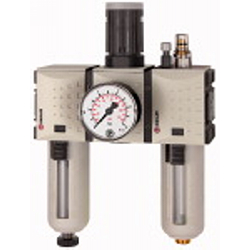 Wartungseinheit 3-tlg. »FUTURA«, PC-Behälter, Schutzkorb und Manometer, BG 4, G 1, Regelbereich 0,5 - 8 bar, Kondensatablass: HA. Dreiteilige Wartungseinheiten in modernem Design und mit hervorragenden Durchflusswerten. Arretierbarer und abschließbarer Membrandruckregler mit Sekundärentlüftung. Öleinfüllung während des Betriebs möglich.