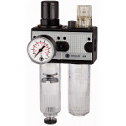 Wartungseinheit 2-tlg. »multifix« mit Polycarbonatbehälter, BG 3, G 1/2, Eingangsdruck max. 16 bar, Regelbereich 0,5 - 10 bar. Zweiteilige Wartungseinheiten, bestehend aus einem vordruckunabhängigen, rücksteuerbaren Membrandruckregler mit Sekundärentlüftung in Verbindung mit einem Zentrifugalabscheider und einem Proportionalöler.
