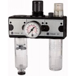 Wartungseinheit 3-tlg. »multifix« mit Polycarbonatbehälter, BG 1, G 3/8, Eingangsdruck max. 16 bar, Regelbereich 0,5 - 10 bar. Dreiteilige Wartungseinheiten, bestehend aus einem vordruckunabhängigen, rücksteuerbaren Membrandruckregler mit Sekundärentlüftung, einem Zentrifugalabscheider und einem Proportionalöler.
