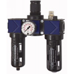 Wartungseinheit 3-tlg. »variobloc«, Polycarbonatbehälter und Schutzkorb, BG 1, G 3/8, PE max. 16 bar, Med.-Umgeb.temp. max. 50 °C. Dreiteilige Wartungseinheiten bestehend aus einem vordruckunabhängigen, rücksteuerbaren Membrandruckregler mit Sekundärentlüftung in Verbindung mit einem Zentrifugalabscheider und einem Proportionalöler. Bewährte Serie in modernem Industriedesign, die sich durch einfaches Handling, bequeme Verblockungsmöglichkeit durch neuartige Verbindungsmodule und hervorragende Durchflusswerte auszeichnet.