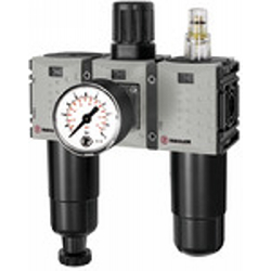 Wartungseinheit 3-tlg. »FUTURA-mini«, Metallbehälter, Standardmano, BG 0, G 1/4, PE 1,5-12 bar, Regelbereich 0,1-4 bar, Ablass: HA. Dreiteilige Wartungseinheiten in modernem Design und mit hervorragenden Durchflusswerten. Arretierbarer Membrandruckregler mit Sekundärentlüftung.