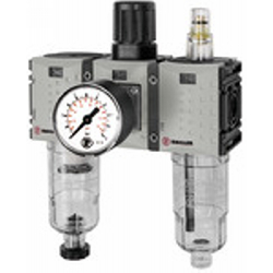 Wartungseinheit 3-tlg. »FUTURA-mini«, PC-Behälter, Standardmano, BG 0, G 1/4, PE 1,5 - 12 bar, Regelbereich 0,5-10 bar, Ablass: HA. Dreiteilige Wartungseinheiten in modernem Design und mit hervorragenden Durchflusswerten. Arretierbarer Membrandruckregler mit Sekundärentlüftung.