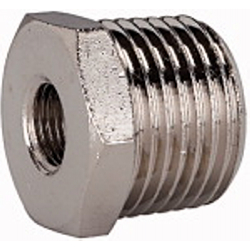 Reduziernippel, R 3/8 a., G 1/8 i., SW 17, Messing vernickelt, Arbeitsdruck max. 25 bar, Betriebstemp. max. 150 °C. Für Luft, Wasser, Öl, Dampf etc. einsetzbar.
