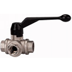 3-Wege-Kugelhahn, T-Bohrung, leichte Ausführ., MS vern., Mediums-/ Umgebungstemp. -15°C bis 100°C, Rp 1 1/2, DN 40, PN max. 16 bar. Allseitig abdichtende Ausführung mit T-Bohrung.