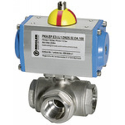 3-Wege-Edelstahlkugelhahn, pneumat. Stellantrieb, T-Bohrung T1, Betriebstemp. -20 °C bis 70 °C, Rp 3/4, DN 20, PN max. 63 bar. 3-Wege-Hahn, reduzierter Durchgang. Pneumatischer Schwenkantrieb in doppelt- oder einfachwirkender Ausführung und integriertem Stellungsanzeiger.