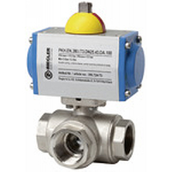 3-Wege-Messingkugelhahn, pneumat. Stellantrieb, T-Bohrung, MS vern., Betriebstemp. -20 °C bis 70 °C, Rp 1, DN 25, PN max. 40 bar. 3-Wege-Hahn, L-Bohrung oder T-Bohrung, voller Durchgang. Pneumatischer Schwenkantrieb in doppelt- oder einfachwirkender Ausführung und integriertem Stellungsanzeiger.