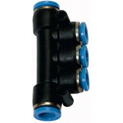T-Mehrfachverteiler, Steckanschluss »Blaue Serie«, 3 red. Abgänge, für Schl.-Außen-Ø 2x8/3x6 mm, max. 15 bar, Kunststoff/MS vern.. Unsere Schnellsteckverbinder-Serie aus Kunststoff bzw. vernickeltem Messing.