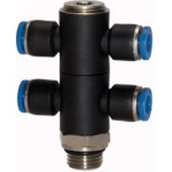 T-Mehrfachverteiler »Blaue Serie«, 4-fach, drehbar, G 1/4 a., für Schl.-Außen-Ø 4 mm, Arbeitsdr. max. 15 bar, Kunststoff/MS vern.. Unsere Schnellsteckverbinder-Serie aus Kunststoff bzw. vernickeltem Messing.