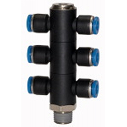 T-Mehrfachverteiler »Blaue Serie«, 6-fach, drehbar, R 1/2 a., für Schl.-Außen-Ø 12 mm, Arbeitsdr. max. 15 bar, Kunststoff/MS vern.. Unsere Schnellsteckverbinder-Serie aus Kunststoff bzw. vernickeltem Messing. Die Teile sind einsetzbar in Verbindung mit Kunststoffschläuchen und Kupferrohren.