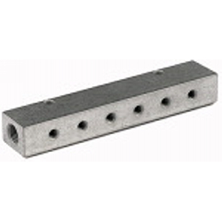 Verteilerleiste, Abgänge einseitig vorne, Eingang 2 x 1/8, Ausgang 6 x M5, Aluminium. Zur einfachen Montage von Druckluft-Entnahmestellen (Verschraubungen, Steckverbinder, Kupplungen etc.). Wahlweise mit 2, 3, 4 oder 6 Abgängen, einseitig oder beidseitig.