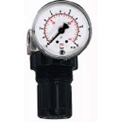 Druckregler für Wasser, inkl. Manometer, G 1/4, Regelbereich 0,2 - 6 bar, Eingangsdruck max. 25 bar, Med.-Umgeb.temp. max. 50 °C. Membrandruckregler ohne Sekundärentlüftung, für Wasser, Druckluft und nicht aggressive Gase.