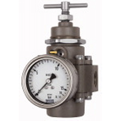 Edelstahl-Guss-Druckregler, 1.4401, mit Sekundärentlüftung (rücksteuerbar), inkl. Mano., BG 4, G 1, Regelbereich 1,7 - 17,5 bar. Edelstahlregler für den Einsatz in der chemischen Industrie, Bergbau, Apparate- und Sondermaschinenbau, Pneumatik, usw. Druckeinstellung mittels Knebelgriff.