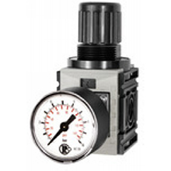 Druckregler, durchg. Druckversorgung »FUTURA-mini«, Standardmano., BG 0, G 1/4, PE max. 12 bar, Regelbereich 0,1 - 4 bar. Anreihbare Membrandruckregler mit Sekundärentlüftung in modernem Design und mit hervorragenden Durchflusswerten. Durch Verblockung von mindestens zwei oder mehreren Reglern können über eine Zuluftzuführung mehrere Arbeitsluftkreise mit verschiedenen Ausgangsdrücken versorgt werden. Arretierbarer Regelknopf.
