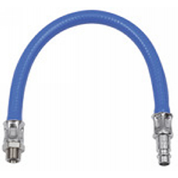 Vibrationsdämpfer mit 300 mm PVC-Werkstattschlauch, Nippel NW 12, G 1/2 AG, verpresst, max. 15 bar, Temp. -20 °C bis 60 °C. Beim Einsatz von pulsierendem Werkzeug empfiehlt sich die Beachtung der ISO 6150, § 7.1. Die Norm empfiehlt, einen mindestens 300 mm langen, flexiblen Schlauch zwischen dem pulsierenden Werkzeug und der Schnellverschlusskupplung zu installieren.