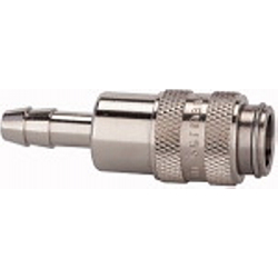 Schnellverschlusskupplung NW 5, Messing vernickelt, Tülle LW 8, Betriebsdruck 0 - 35 bar, Mediums-/Umgebungstemp. -20°C bis 100°C. Einseitig absperrende Einhand-Schnellverschlusskupplung mit kleinen Baumaßen und großem Durchgang bei geringem Druckabfall. Um Verletzungen oder den Peitschenhiebeffekt zu vermeiden, empfehlen wir den Stecknippel beim Entkuppeln mit einer Hand festzuhalten.
