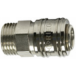 Schnellverschlusskupplung NW 7,2 »connect line«, MS vern., G 1/2 AG, Betriebsdr. 0 - 35 bar, Mediums-/Umgeb.temp. -20°C bis 100°C. Die universelle Einhand-Schnellverschlusskupplung in einseitig absperrender Ausführung zu einem enorm günstigen Preis. Durch die geschlossene Verriegelungshülse wird ein Verschmutzen der Innenteile verhindert. Bei Verwendung von Stahlnippeln kann diese Kupplung aufgrund ihrer gehärteten Verriegelungsstifte auch an Druckluftwerkzeugen verwendet werden. Um Verletzungen oder den Peitschenhiebeffekt zu vermeiden, empfehlen wir den Stecknippel beim Entkuppeln mit einer Hand festzuhalten.