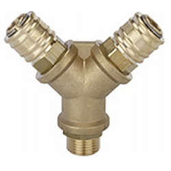 Verteiler mit 2 Schnellverschlusskuppl. NW 7,2, »R26EMS«, Messing blank, G 1/2 AG, Betriebsdruck 0-35 bar, Temp. -20 °C bis 100 °C. 2-fach-Verteilerstücke aus Messing blank, fertig konfektioniert mit Schnellverschlusskupplung NW 7,2. Wahlweise mit Anschlussgewinde innen oder außen.
