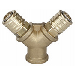 Verteiler mit 2 Schnellverschlusskuppl. NW 7,2, »R26EMS«, Messing blank, G 3/8 IG, Betriebsdruck 0-35 bar, Temp. -20 °C bis 100 °C. 2-fach-Verteilerstücke aus Messing blank, fertig konfektioniert mit Schnellverschlusskupplung NW 7,2.