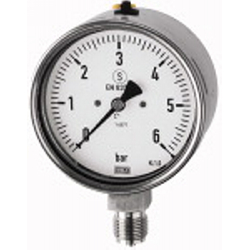 Manometer aus CrNi-Stahl, Sicherheitsausf., Anschluss radial unten, G 1/2, Typ 232.30, Güteklasse 1,0, Messber. 0 - 1,0 bar, Ø 100. Rohrfedermanometer (Sicherheitsausführung) in CrNi-Stahl-Ausführung mit bruchsicherer Trennwand (Solidfront) und ausblasbarer Rückwand.