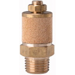Schalldämpfer, Sinterbronce/Messing, Abluft einstellbar, M5, SW 8 mm, Betriebsdruck max. 0 bar, Betriebstemp. -10 °C bis 250 °C. Über eine Justierschraube kann das Abluftvolumen eingestellt werden, Fixierung durch Kontermutter.
