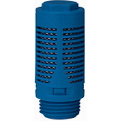 Kunststoff-Schalldämpfer, Stahlnetz- und Baumwollstreifenfüllung, G 1/4, Betriebsdruck max. 12 bar, Betriebstemp. -20 °C bis 70 °C. Durch die Stahlnetz- und Baumwollstreifenfüllung entweicht nur Luft. Verunreinigungen werden zurückgehalten. Höherer Geräuschdämpfungsgrad.