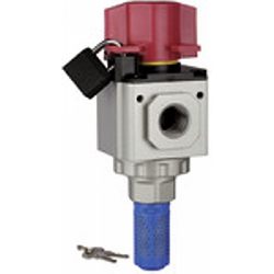 3/2-Wege-Absperrventil »G« mit Haltewinkel, Vorhängeschloss u. Schalldämpfer, handbetätigt, BG 400, G 3/8, Eingangsdruck 0 - 9 bar. Mit Knebelgriff, 90 ° drehbar, abschließbar. Das Ventil dient zum Abschalten der Luftversorgung und wird in der Regel Druckreglern, Filterreglern oder Wartungseinheiten vorgebaut. Beim Schließen des Ventils entweicht die restliche angestaute Luft auf der P2-Seite über die unten angebrachte Entlüftungsbohrung in die Atmosphäre.