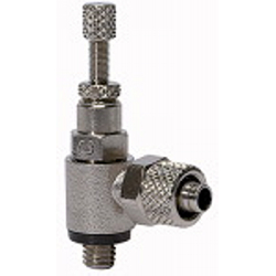Drosselrückschlagventil, Abluftdrosselung (»C«) Schnellverschr. Schlauch 6/4, G 1/8, PN max. 10 bar, Temp. 0°C bis 70°C, MS vern.. Zur feinen Regulierung der Kolbengeschwindigkeit von Zylindern und von Durchflussmengen. Ausführung in Hohlschraubenbauweise mit Ringstück. Zum direkten Einschrauben am Ventil oder Zylinder. Kleine Baumaße, ideal bei engen Platzverhältnissen. Der eingestellte Volumenstrom kann bei der Ausführung mit Rändelschraube mit der Sechskant-Mutter gekontert und somit fest eingestellt werden.