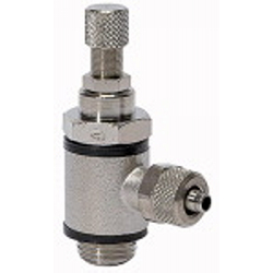 Drosselrückschlagventil, Zuluftdrosselung (»V«) Schnellverschr. Schlauch 10/8, G 1/4, PN max. 10 bar, Temp. 0°C bis 70°C, MS vern.. Zur feinen Regulierung der Kolbengeschwindigkeit im Vor- und Rücklauf von Zylindern und von Durchflussmengen. Ausführung in Hohlschraubenbauweise mit Ringstück. Zum direkten Einschrauben am Ventil oder Zylinder. Kleine Baumaße, ideal bei engen Platzverhältnissen. Der eingestellte Volumenstrom kann bei der Ausführung mit Rändelschraube mit der Sechskant-Mutter gekontert und somit fest eingestellt werden.