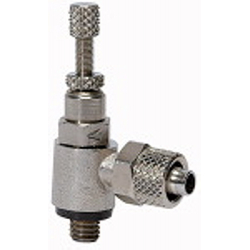 Drosselrückschlagventil, Zuluftdrosselung (»V«) Schnellverschr. Schlauch 8/6, G 1/8, PN max. 10 bar, Temp. 0°C bis 70°C, MS vern.. Zur feinen Regulierung der Kolbengeschwindigkeit im Vor- und Rücklauf von Zylindern und von Durchflussmengen. Ausführung in Hohlschraubenbauweise mit Ringstück. Zum direkten Einschrauben am Ventil oder Zylinder. Kleine Baumaße, ideal bei engen Platzverhältnissen. Der eingestellte Volumenstrom kann bei der Ausführung mit Rändelschraube mit der Sechskant-Mutter gekontert und somit fest eingestellt werden.