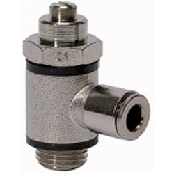 Dros.rücks.ventil, Schlitzschr., Abluftdros. (»C«) Steckverb. Schlauch 10, G 3/8, PN max. 10 bar, Temp. 0 °C bis 70 °C, MS vern.. Zur feinen Regulierung der Kolbengeschwindigkeit von Zylindern und Durchflussmengen. Ausführung in Hohlschraubenbauweise mit Ringstück. Zum direkten Einschrauben am Ventil oder Zylinder. Kleine Baumaße, ideal bei engen Platzverhältnissen.