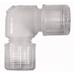 Winkel-Schlauchverbindung, für Schlauch 6/8 mm, Arbeitsdruck max. 10 bar (20 °C) / max. 1 bar (170 °C), PFA. Perfluoralkoxy (PFA): ein Fluorkunststoff, der die gleiche chemische Resistenz wie PTFE hat, aber bedeutend höhere Festigkeitswerte aufweist und für Temperaturen von max. 200 °C geeignet ist.