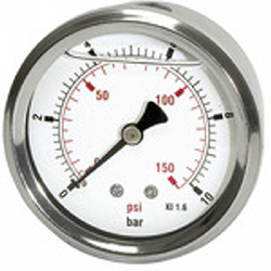 Glyzerinmano. »pressure line«, CrNi-Stahl-Gehäuse, Anschluss hinten zentr., G 1/4, Gütekl. 1,6, Messber. 0-100,0 bar/1500 psi, Ø63. Preiswerte Serie von hochwertigen Glyzerinmanometern mit Edelstahlgehäuse für Anwendungen bei Messstellen mit hohen dynamischen Druckbelastungen oder Vibrationen.