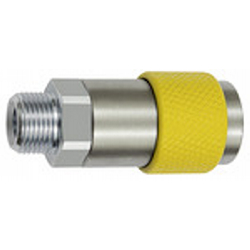 Unverwechselbare Dreh-Sicherheitskupplung NW 6, ISO 6150 C, Stahl, 2-stufig, G 1/4 AG, gelb, max. 25 bar, Temp. -15 °C bis 200 °C. Hochwertige, robuste und langlebige, mit einer Hand bedienbare Dreh-Sicherheitskupplung. Durch Eindrücken des Stecknippels, bis dieser hörbar rastet, wird eine sichere Verbindung hergestellt. Das Entkuppeln erfolgt über eine Linksdrehung der Hülse. Hierbei wird der anstehende Druck in der Kupplung und in der Leitung entlüftet, jedoch wird der Stecknippel über eine Sicherheitsklinke nicht komplett freigegeben. Erst nach einer Rechtsdrehung der Hülse kann der Stecknippel herausgezogen werden. Durch die Farb- und Formkodierung von Kupplung und Stecknippel, ist ein Einkuppeln nur innerhalb der gleichen Farben möglich.